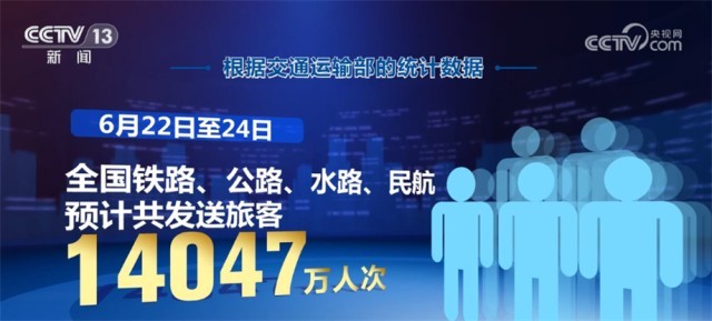 交通运输部数据显示,端午假期(22日至24日),全国铁路、公路、水路、民航预计共发送旅客14047万人次,比2019年同期下降22.8%,比2022年同期增长89.1%。