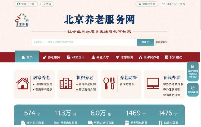 平台汇集了北京市574家备案养老机构、11.3万张养老机构床位、1469家养老服务驿站、1476家养老助餐点的详情介绍,并配套养老资源地图查询功能,实现了从“查找”“预约”到“咨询”“办理”的一站式、全过程服务,方便老年人随时随地了解“家门口”的养老服务资源。