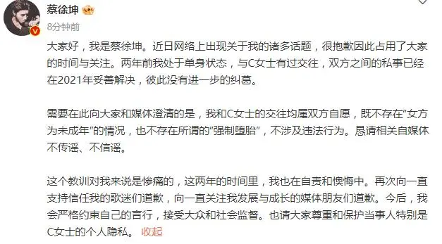 全文如下:大家好,我是蔡徐坤。近日网络上出现关于我的诸多话题,很抱歉因此占用了大家的时间与关注。两年前我处于单身状态,与C女士有过交往,双方之间的私事已经在2021年妥善解决,彼此没有进一步的纠葛。需要在此向大家和媒体澄清的是,我和C女士的交往均属双方自愿,既不存在“女方为未成年”的情况,也不存在所谓的“强制堕胎”,不涉及违法行为。恳请相关自媒体不传谣、不信谣。这个教训对我来说是惨痛的,这两年的时间里,我也在自责和懊悔中。再次向一直支持信任我的歌迷们道歉,向一直关注我发展与成长的媒体朋友们道歉。今后,我会严格约束自己的言行,接受大众和社会监督。也请大家尊重和保护当事人特别是C女士的个人隐私。