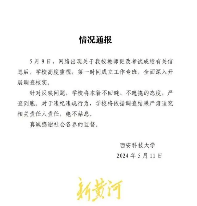 针对上述事件,5月11日,西安科技大学官网发布情况通报称,学校高度重视此事,第一时间成立工作专班,全面深入开展调查核实。针对反映问题,学校将本着不回避、不遮掩的态度,严查到底。对于违纪违规行为,学校将依据调查结果严肃追究相关责任人责任,绝不姑息。