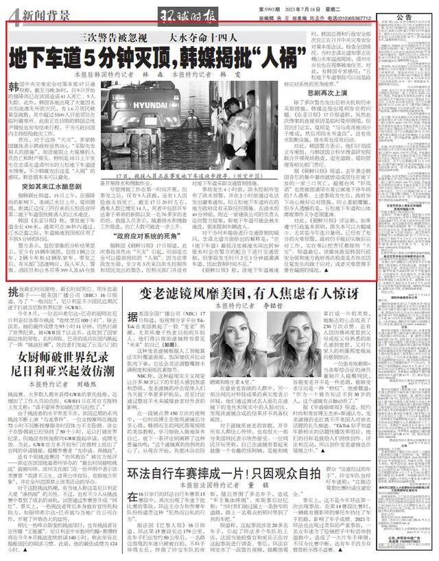 然而,对于这场“天灾”,多家韩国媒体表示韩政府虽然决心“采取先发制人的措施”,却没能阻止大规模的人员伤亡和财产损失。特别是15日上午发生在忠清北道清州市的五松地下车道浸水惨案,