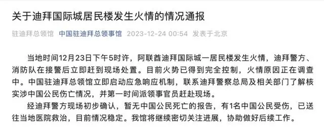 中国驻迪拜总领事馆24日发布关于迪拜国际城居民楼发生火情的情况通报