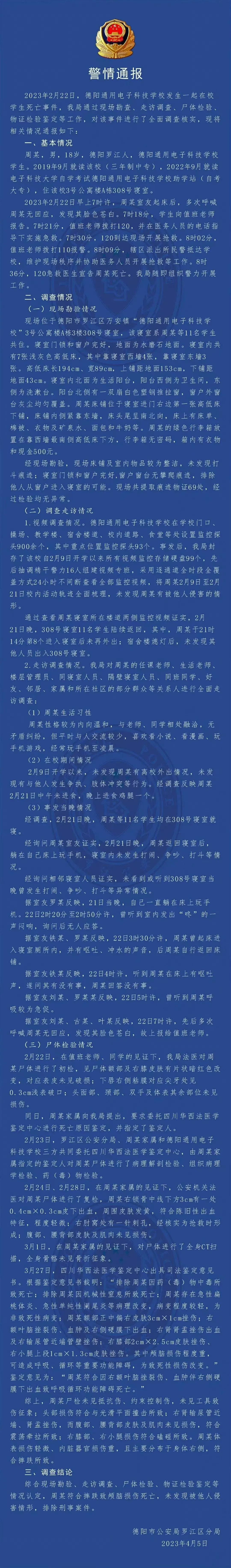 据@罗江警方消息,4月5日,四川德阳市公安局罗江区分局发布警情通报,2023年2月22日,德阳通用电子科技学校发生一起在校学生死亡事件。警方通过现场勘查、走访调查、尸体检验、物证检验鉴定等工作,对该事件进行了全面调查核实,认定周某符合摔跌致颅脑损伤死亡,排除刑案。
