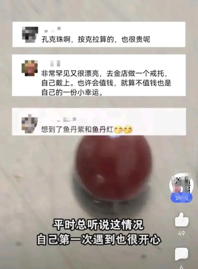 女子称买28元河蚌疑发现红色孔克珠 鉴定属实但不是特别珍贵的品种