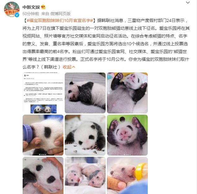 据韩联社消息,三星物产度假村部门24日表示,将为上月7日在旗下爱宝乐园诞生的一对双胞胎熊猫幼崽线上线下征名。爱宝乐园将在其视频网站、照片墙等官方社交媒体和官网启动征名活动。在综合考虑熊猫的特点、名字的意义、发音、重名率等因素后,爱宝乐园方面将选出10个候选名,并通过线上投票选出得票率最高的前4名字。粉丝们可通过爱宝乐园官网、社交媒体、爱宝乐园的“熊猫世界”等线上线下渠道进行投票。正式名字将于10月公布。你会为福宝的双胞胎妹妹们取什么名字?