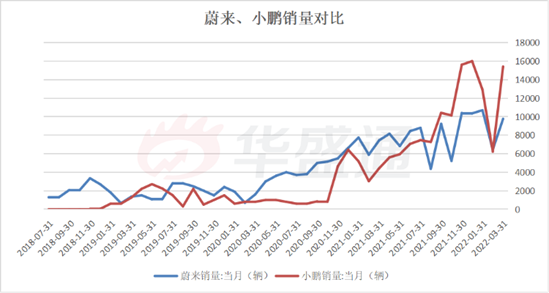2021Q3开始,蔚来销量被小鹏反超,前后有2次重要事件的影响,包括2021年3月因缺芯导致停产5个工作日,以及2022年4月因部分地区疫情导致供应链受阻的停产。而小鹏月销量一度超过1.6万辆,远超蔚来的月销记录,后者销量多次掉出头部玩家行列。
