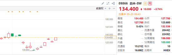 消息放出后,部分资金开始“用脚投票”。蔚来港股股价从5月13日开始计算,到5月18日上涨超过29%,此前10个交易日的交易量也呈放量趋势。美东时间5月17日美股,蔚来更是大涨14.3%,在中概股中涨幅居前,从5月12~18日蔚来股价上涨超过24%。