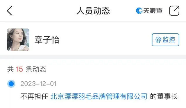 据天眼查显示,今(1)日,北京漂漂羽毛品牌管理有限公司(下称“漂漂羽毛”)发生多项工商变更,包括法定代表人、执行董事、董事长、总经理等。其中,章子怡卸任董事长职务。