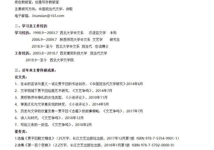 官网还介绍了贾浅浅近年来主要的科研成果,包括选编《贾平凹散文精选》和诗集《第一百个夜晚》,以及课题项目《贾平凹书画与文学艺术精神关联性研究》,论文《生命的言说与意义—试论贾平凹的书法创作》《文学视域下贾平凹绘画艺术研究》等。