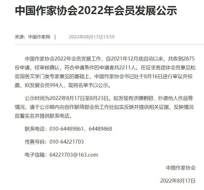 中国作家协会2022年会员发展公示。来源:网页截图中国作家协会2022年会员发展公示。来源:网页截图