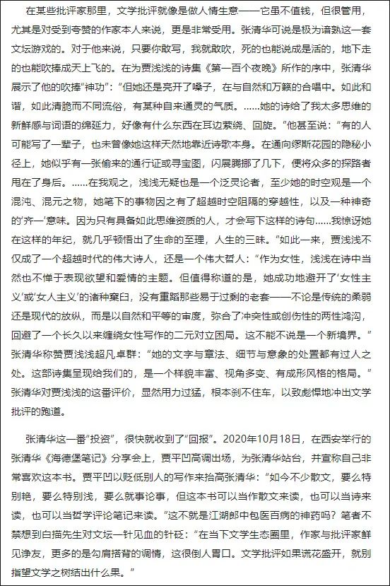 作者称,“在为贾浅浅的诗集《第一百个夜晚》所作的序中,张清华展示了他的吹捧‘神功’”,随后,“在西安举行的张清华《海德堡笔记》分享会上,贾平凹高调出场,为张清华站台”。