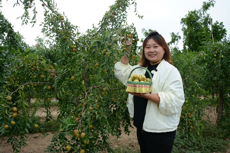 2024年9月12日,河南省内黄县直播达人申艳艳正在东庄镇西柴庄村蟠枣园种植基地帮助枣农范水展采摘蟠枣和现场直播销售蟠枣。今年,该县种植的150000亩红枣喜获丰收,其中,范水展种植10亩新品种蟠枣硕果累累,助力乡村振兴。近年来,该县以党建引领,以“党支部+合作社+农户”的形式,通过调整农业种植结构和培育“新农人”,大力发展枣树新品种产业种植。并积极推广新技术、新品种引进,让产量、质量、品质和口感,走出了特色种植红枣产业发展新路子,助农增收。
